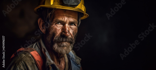 © Lubo Ivanko, Obraz premium Older Caucasian man with face dirty, helmet on his head, dark background space for text right, to emphasise deep mine - natural resource miner, hard working conditions mining industry. Generative AI
