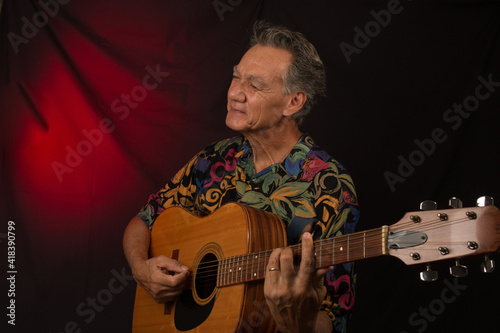 © Marcos, Obraz premium Older Man having fun playing his acoustic guitar against a red lit background