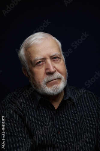 © mira_y, Obraz premium Older man with white beard and gray hair sits in front of plain background while looking straight ahead in a traditional setting