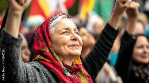 Fototapeta premium Older woman, red headscarf, protest, raised fists, hope.