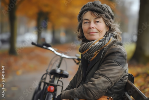 © BARLOP, Obraz premium OLDER WOMAN SITTING ON A PARK BENCH WITH HER BIKE NEXT.