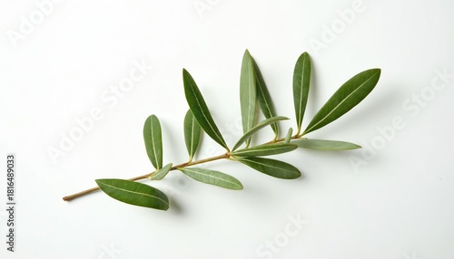 © Pete, Fototapeta premium Olive branch lies on white backdrop. Fresh green leaves grow on twig. Simple studio shot presents natural plant. Nature macro image for culinary and cosmetic industry projects.