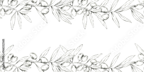 © Fofito, Fototapeta premium Olive branch pencil drawing clipart extending horizontally, with detailed leaves and fruit. Seamless border illustration for use in product labels, website design, or as a decorative border