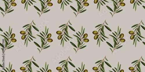 Naklejka premium Olive branch with leaves an olives summer spring seamless repeating pattern,...