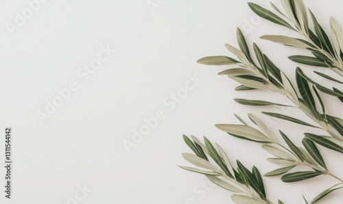 © Yopi, Fototapeta premium Olive Branches on White Background Minimalist Nature Photography