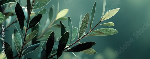 Fototapeta premium Olive green color stylish stock photo of backlit plant leaves on a branch with nature background. Natural backdrop for organic and healthy concepts.