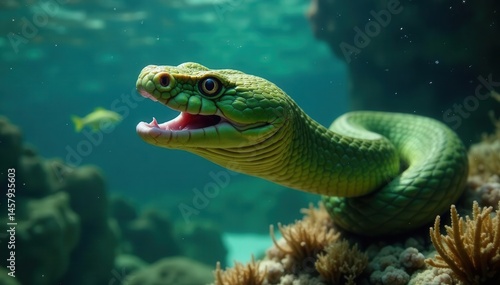 © Birdkab, Fototapeta premium Olive green sea snake swallowing fish underwater, wildlife, olive, predator