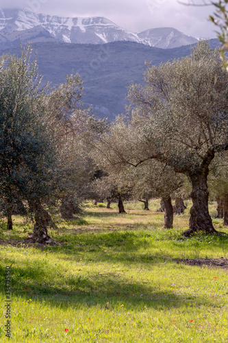 Obraz premium Olive grove on a background of snow-capped mountains