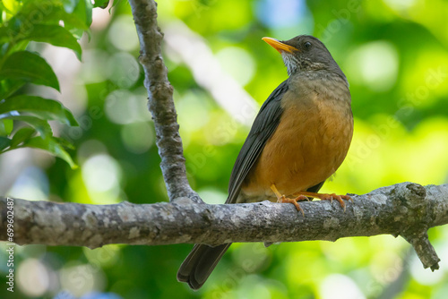 © gozzoli, Fototapeta premium Olive Rock Thrush (Turdus olivaceus) on branch in Afromontane forest habitat, Wilderness, Garden Route, South Africa