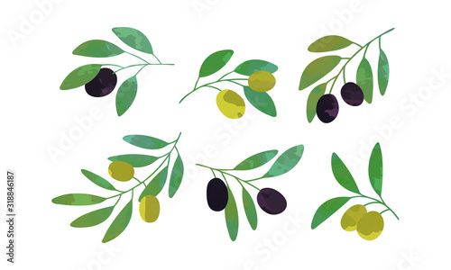© topvectors, Naklejka premium Olive Tree Branches with Green and Black Fruits Collection, Healthy Organic Product Vector Illustration Vector Illustration