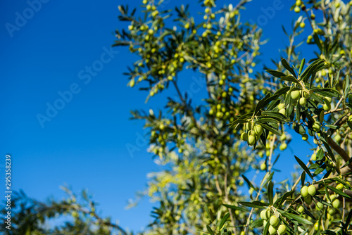 Fototapeta premium Olives on the tree against blue sky. Selective Focus.