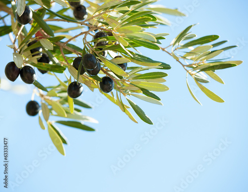 © Antonel, Obraz premium Olives on the tree against blue sky. Selective Focus.