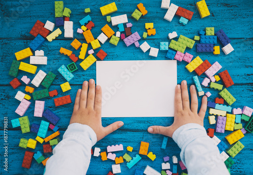 © nataliaderiabina, Fototapeta premium Сolourful creative children's background with colored toy bricks