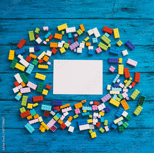 © nataliaderiabina, Naklejka premium Сolourful creative children's background with colored toy bricks