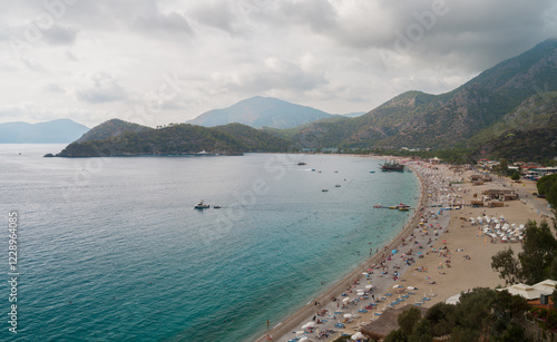 © daphnusia, Fototapeta premium Oludeniz beach in the autumn season. Holiday on the Mediterranean coast of Turkey. Fethiye district, Mugla province, Turkey country