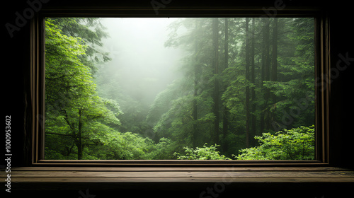 Fototapeta premium Olympic National Park, rainforest canopy with mosscovered trees, misty atmosphere, view from a wooden cabin window
