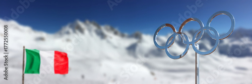 Fototapeta premium Olympic rings, italian flag and snowy mountains in the Alps panoramic...