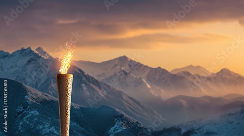 Fototapeta premium Olympic Torch in Mountain Landscape at Sunset. Concept for the Winter Sports 2026 in Italy.