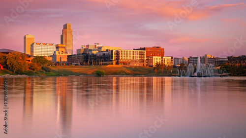 Naklejka premium Omaha, Nebraska, USA. Cityscape image of downtown Omaha, Nebraska with reflection of the skyline at beautiful autumn sunrise.