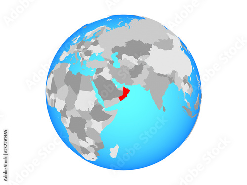 © harvepino, Naklejka premium Oman on blue political globe. 3D illustration isolated on white background.