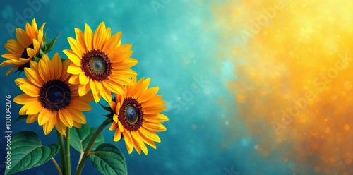 © Sarayuth, Fototapeta premium Ombre sunflowers in a blue and yellow gradient background with orange accents, orange, sunflowers