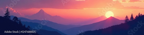 Fototapeta premium Ombre sunset on a mountain range with wispy clouds and trees, serene, texture