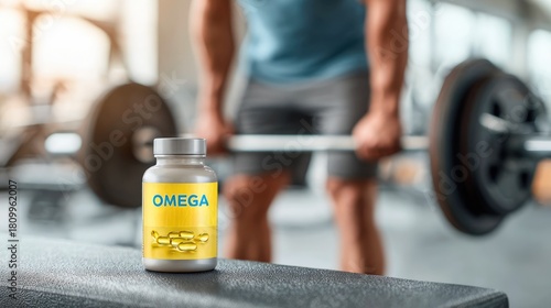 © Andrii , Fototapeta premium Omega Supplement Bottle in Gym Environment