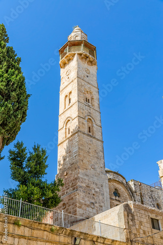 © Dario Bajurin, Fototapeta premium Omer mosque minaret in front of the Church of the Holy Sepulchre in Jerusalem, Israel.