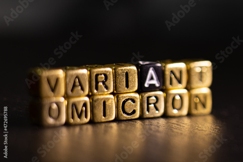 © Emvats, Obraz premium OMICRON Variant name reveal. SARS-CoV-2 Coronavirus Variant Omicron. Black background.