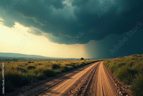Fototapeta premium Ominous clouds gather above a lone, winding dirt track , photography, stormy,...