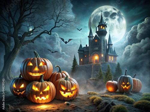 © Man888, Naklejka premium Ominous Halloween scene featuring eerie pumpkins, ghostly apparitions, and a haunted castle set against a dark, mysterious, and spooky black backdrop.