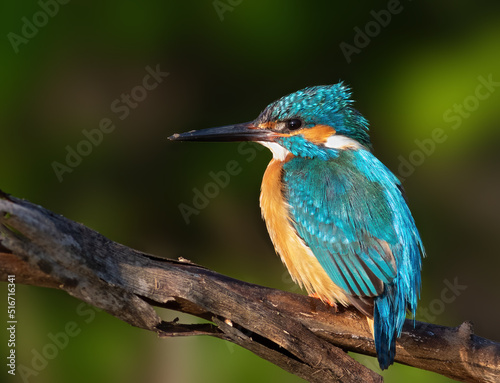 Fototapeta premium Сommon kingfisher, Alcedo atthis. A bird sits on a branch against a beautiful blurry green background