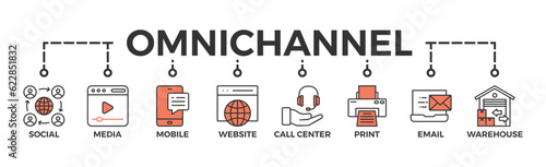 © Dawiyyah, Naklejka premium Omnichannel banner web icon vector illustration concept with icon of social media, mobile, website, call center, print, email, and warehouse