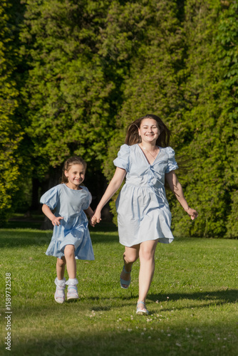 © Татьяна Зернова, Obraz premium On a beautiful summer day, a mother and daughter are playing and running around the park.