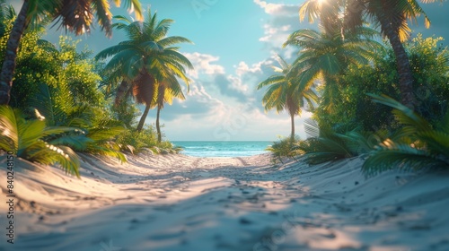 Fototapeta premium On a blue background coconut trees with beach sand are surrounded by beach...
