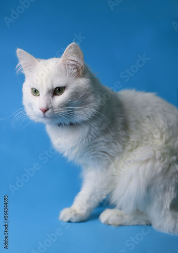 Fototapeta premium on a blue background sits a white fluffy pet cat with green eyes and a pink...
