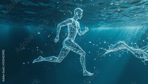 © yassine, Fototapeta premium On a blue gradient background, a silhouette of a running man filled with blue water represents concepts of sport, fitness hydration, healthy living, or wellness.