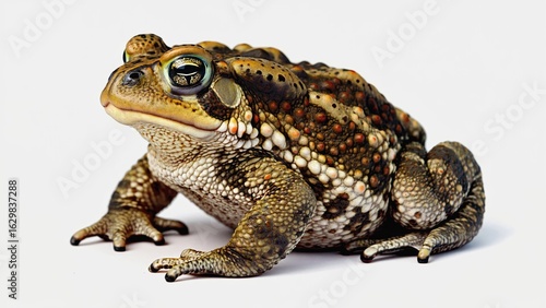 © Светлана Громак, Fototapeta premium On a light gray background there is a large toad with pimply skin mixed with brown, beige and red shades. Golden eyes with dark pupils emphasize her uniqueness and character.