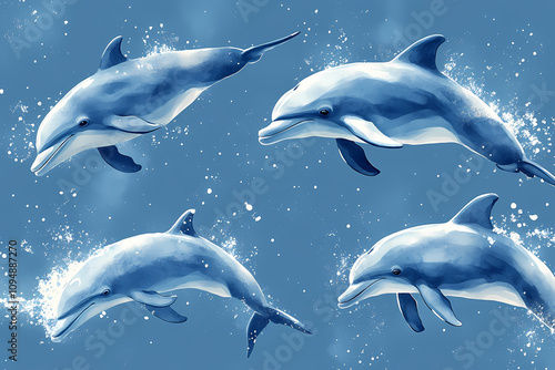 Fototapeta premium On a pastel blue background, small silhouettes of dolphins are arranged in a...