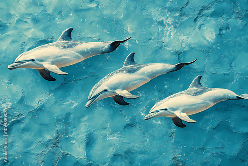 © Akharadat, Obraz premium On a pastel blue background, small silhouettes of dolphins are arranged in a pattern