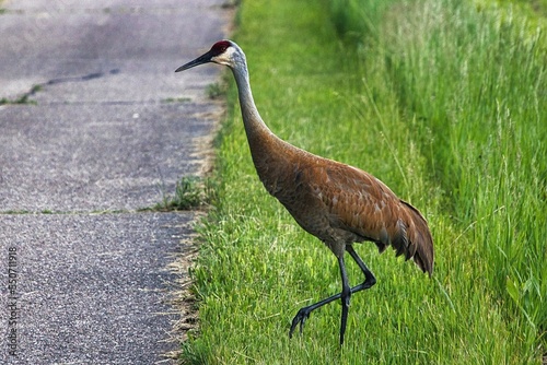 © Dave, Obraz premium On a summer day in Wisconsin, a Sandhill Crane prepares to leave the safety of a green field and step onto an asphalt roadway.
