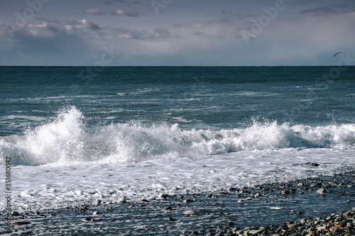 Fototapeta premium On a sunny day, a storm in the sea wave breaks on the shore. Winter sea...