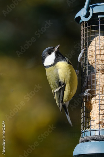 Naklejka premium On a sunny day, a titmouse sits on a feeding trough.