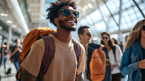 © AN STOCK, Fototapeta premium On a sunny summer day, a group of young professionals with stylish backpacks and sunglasses laugh and chat as they walk through a bustling airport terminal