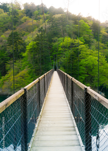 © takahashikei1977, Obraz premium On a suspended bridge in a quiet mountain