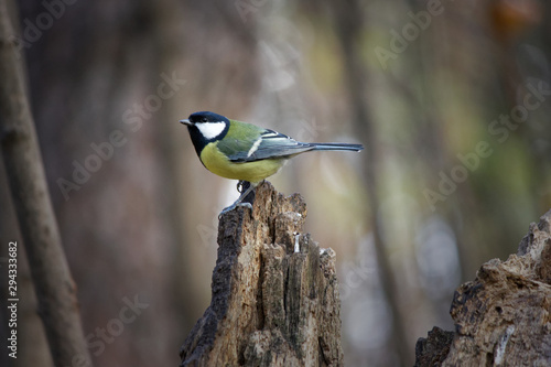 Naklejka premium on a tree.Tit decided to relax a bit before the next flight in search of food.