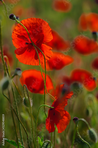 © Владимир Лис, Obraz premium On a warm day. Red poppies are blooming. Bees collect nectar. Close-up.
