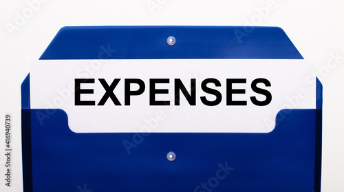 Fototapeta premium On a white background, a blue folder for papers. In the folder is a sheet of paper with the word EXPENSES