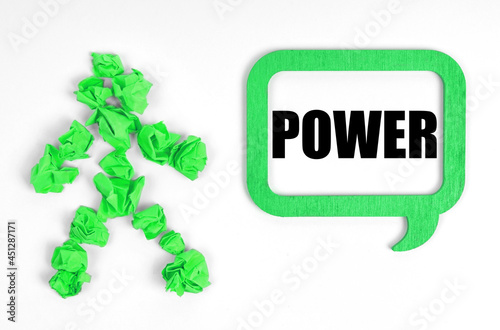 © Dzmitry, Obraz premium On a white background, a green paper man and a sign with the inscription - POWER