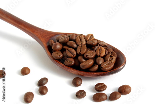 © DENIS , Obraz premium On a white background lies a wooden spoon with coffee beans